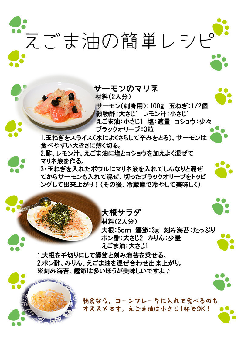 | 胡麻、大豆、グレープシードオイル、 オリーブオイル、米油 | 魚、アマニ、エゴマ、チアシード、 カメリナオイル |